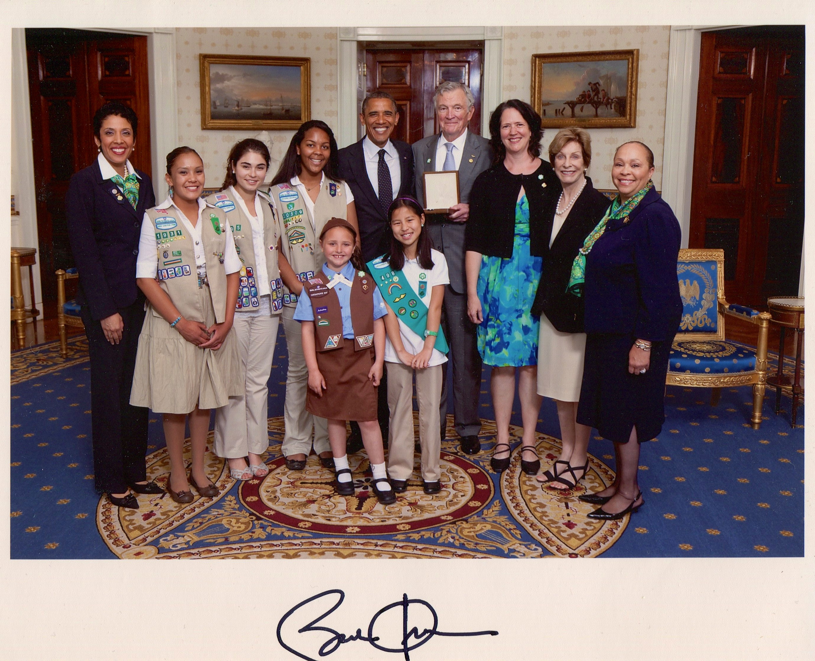 On the left is Anna Maria Chavez, CEO of the Girl Scouts of the U.S.A. To the right of President Obama are Richard Platt (Juliette’s great-nephew), Margaret M. Seiler (Juliette’s great-niece), Audrey Platt (Richard’s wife) and Connie Lindsey, Chair of the National Board of Directors of the Girl Scouts of the U.S.A. With them are five really lucky girls!